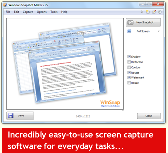 WinSnap is a clean, fast, simple and user-friendly utility for taking and editing screenshots. It can easily capture windows of non-rectangular form with customized and transparent backgrounds, including Aero Glass on Windows 7 and Vista. WinSnap adds eye-candy drop shadows, reflections, rotations, watermarks and other effects on the fly. It supports a variety of image formats and provides advanced auto-save features.